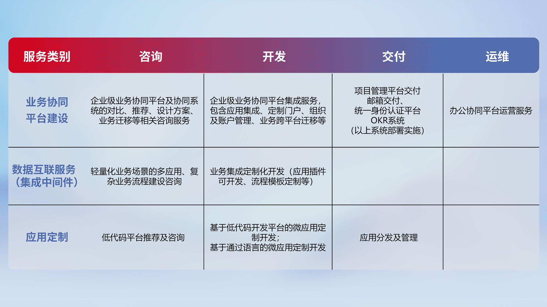 针对钉钉、、企微、、IDaas等平台级产品提供产品的规划、、、方案、、交付、、、、定制化开发等服务,,实现如统一协同办公、、、、智能客户服务、、、、混合会议管理、、智能数据查询、、、等业务场景,,实现数字化转型。。