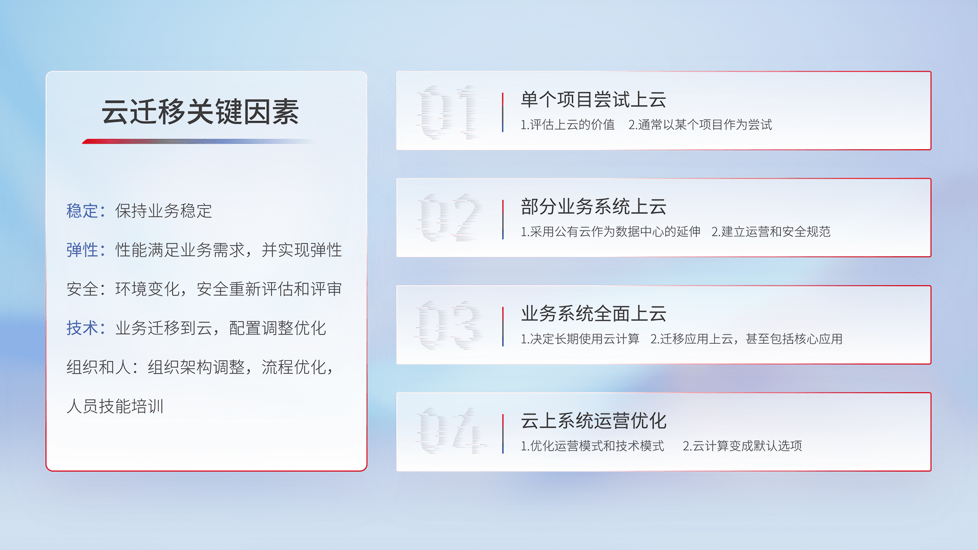 结合实际业务,,,从规划设计、、云平台选型、、、云原生改造、、、、数据迁移、、集成交付,,迁移全过程为客户识别最佳上云路径,,,,做好风险识别管理,,,,设计网络架构、、身份权限、、、、安全审计合规、、、、操作审计、、日志审计、、、、监控告警策略、、多站点容灾设计等,,,,对云上基础设施进行整体规划,,,,提升IT治理水平,,以满足弹性、、、、高可用、、高性能的需求。。